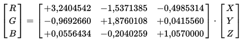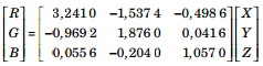 R = 3.2410X - 1.5374Y - 0.4986Z G = -0.9692X + 1.8760Y + 0.0416Z B = 0.0556X - 0.2040Y + 1.0570Z |