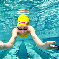 Portrait of a woman in a swimmingsuit, taken with a camera from below.